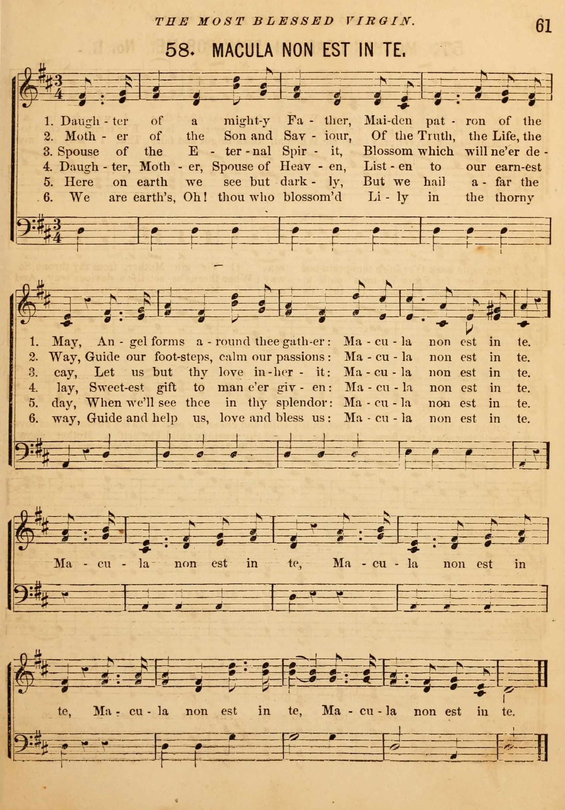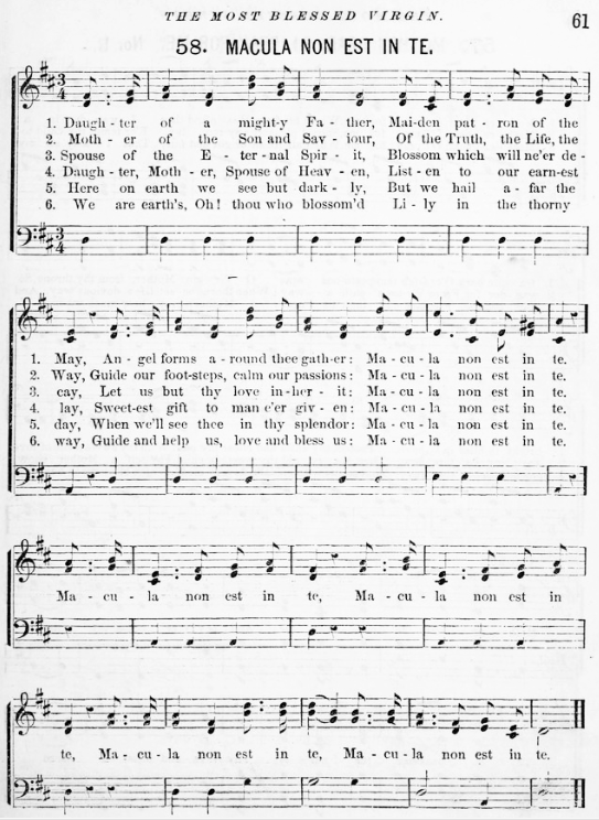 1) Daughter of a mighty father, Maiden patron of the May; Angel forms around thee, gather, Macula non est in te (×5). |