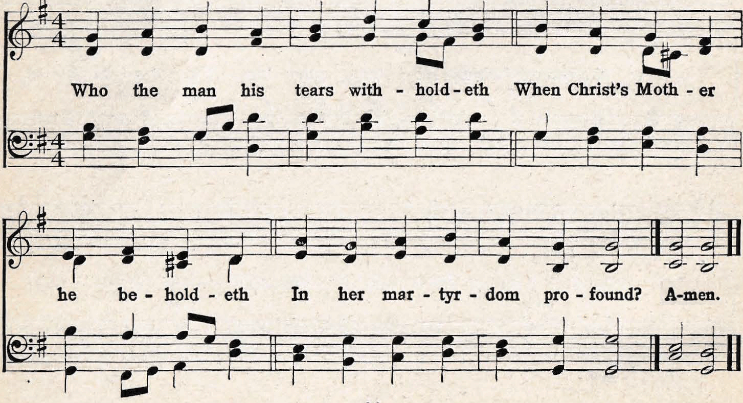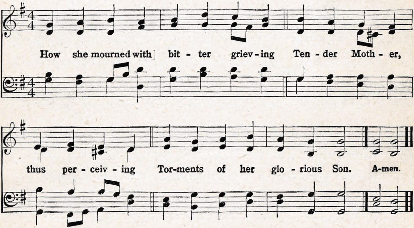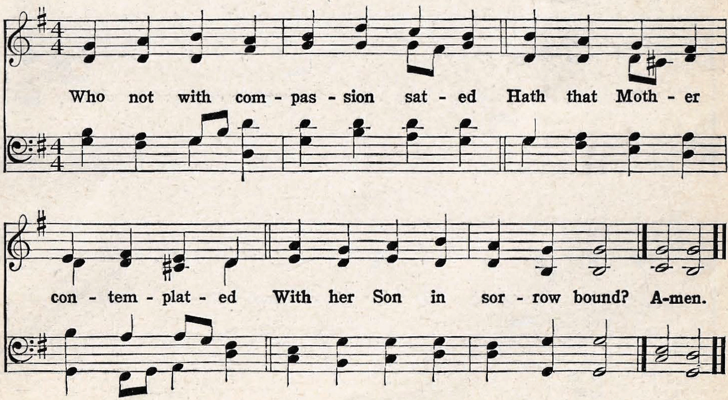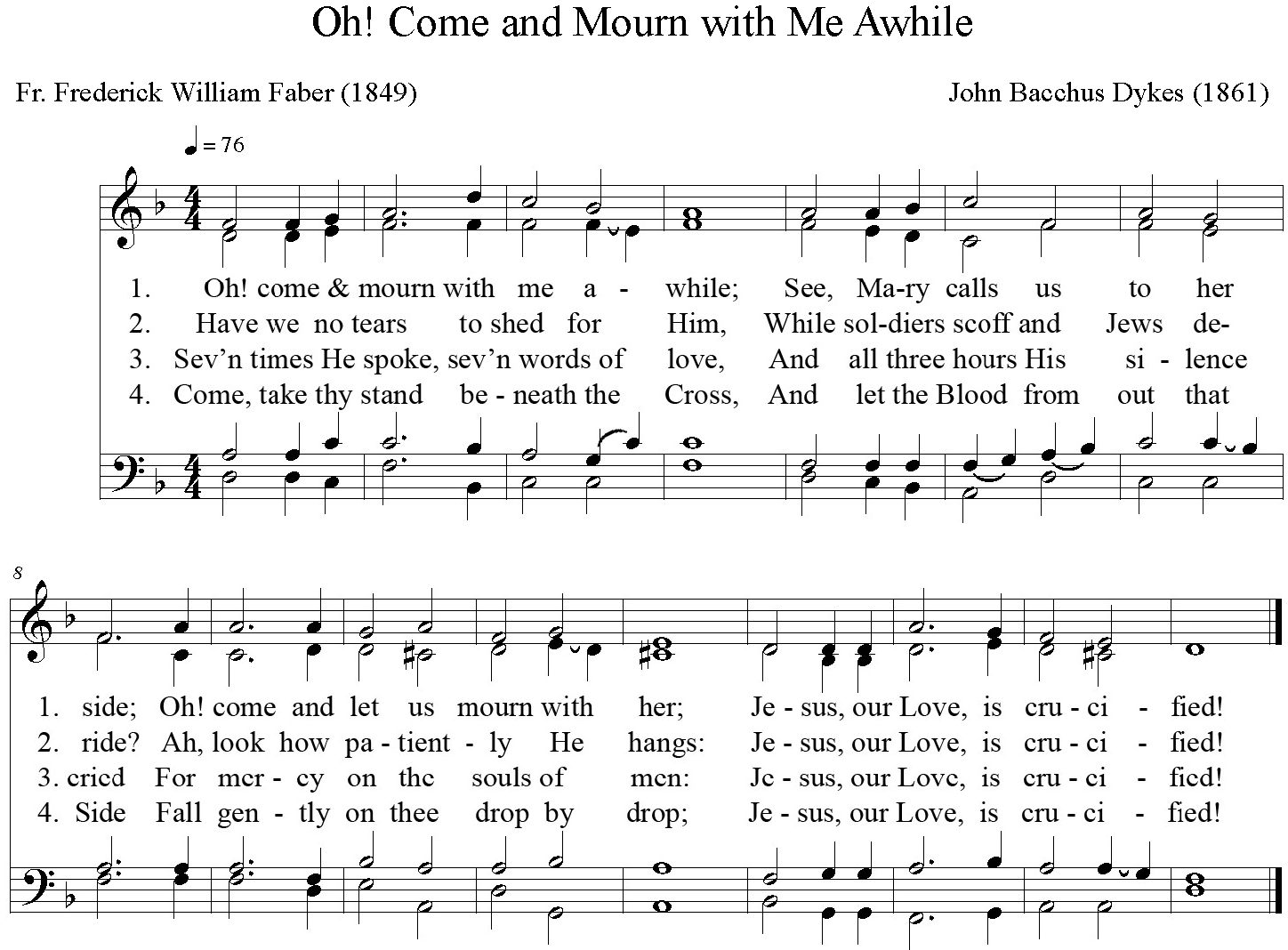 | 1. Oh! come and mourn with me awhile; See, Mary calls us to her side; Oh! come and let us mourn with her; Jesus, our Love, is crucified! |