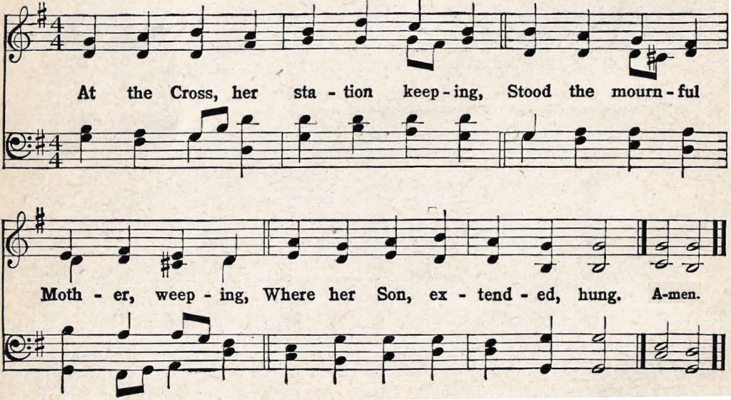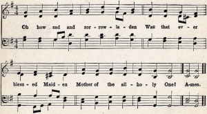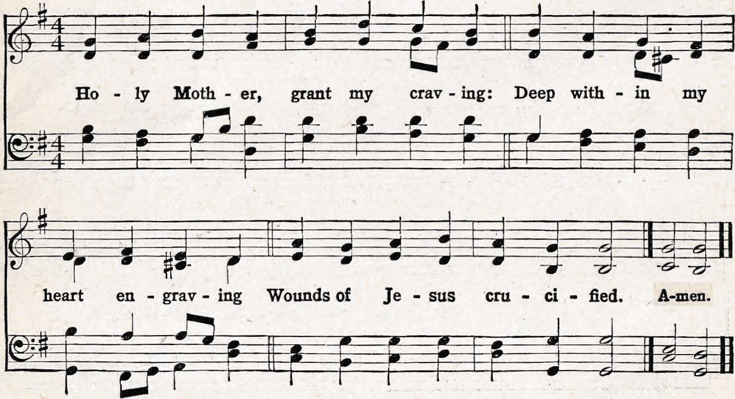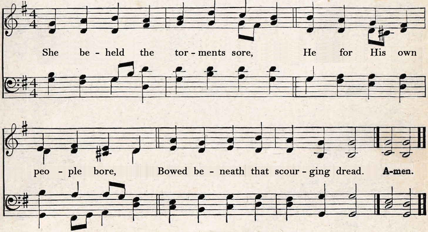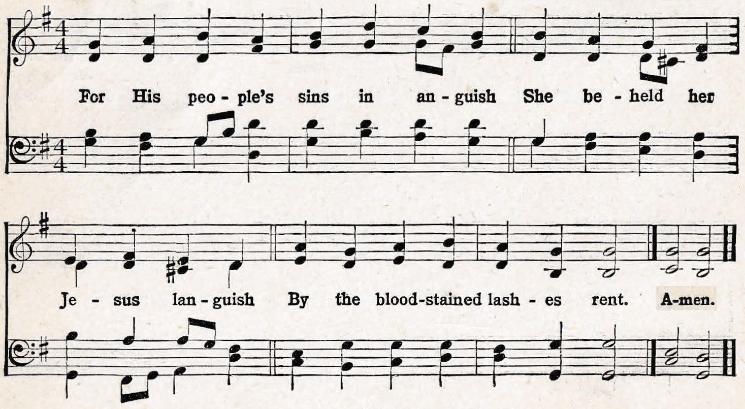 | 1. Oh! come and mourn with me awhile; See, Mary calls us to her side; Oh! come and let us mourn with her; Jesus, our Love, is crucified! |