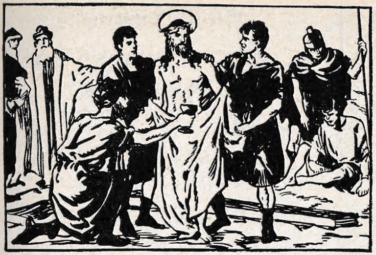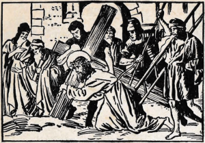 Priest: Consider this first fall of Jesus under His Cross. His flesh was torn by the scourges, His Head crowned with thorns, and He had lost a great quantity of blood. He was so weakened that He could scarcely walk; and yet He had to carry this great load upon His shoulders. The soldiers struck Him rudely, and thus He fell several times in His journey.