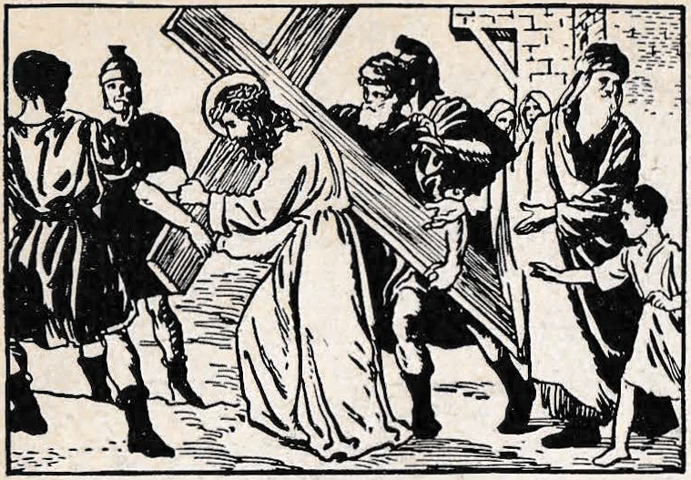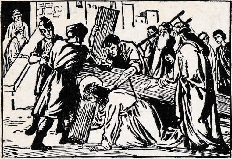 Priest: Consider how the Jews, seeing that at each step Jesus was on the point of expiring, and fearing He would die on the way, when they wished Him to die the ignominious death of the Cross, constrained Simon the Cyrenean to carry the Cross behind our Lord.