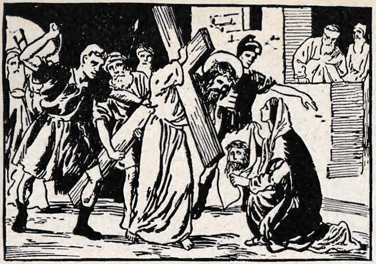 Priest : Consider how the holy woman named Veronica, seeing Jesus so afflicted, and His face bathed in sweat and Blood, presented Him with a towel, with which He wiped His adorable Face, leaving on it the impression of His holy Countenance.
