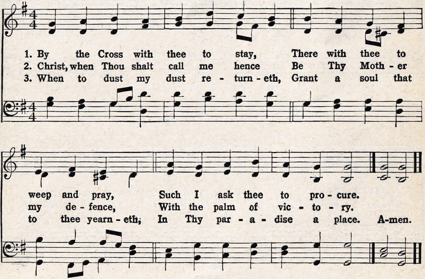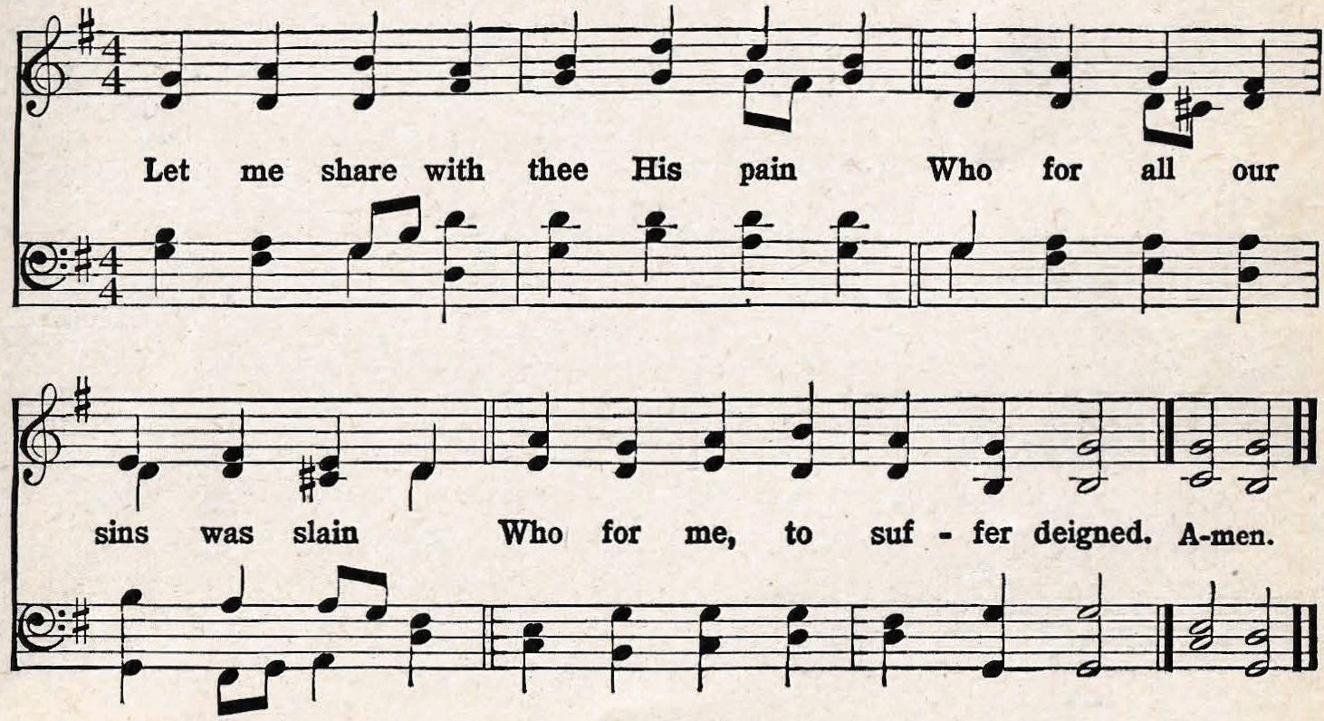 | 3. In this, Thy bitter passion, Good Shepherd, think of me With Thy most sweet compassion, Unworthy though I be: Beneath Thy cross abiding For ever would I rest, In Thy dear love confiding, And with Thy presence blest. |