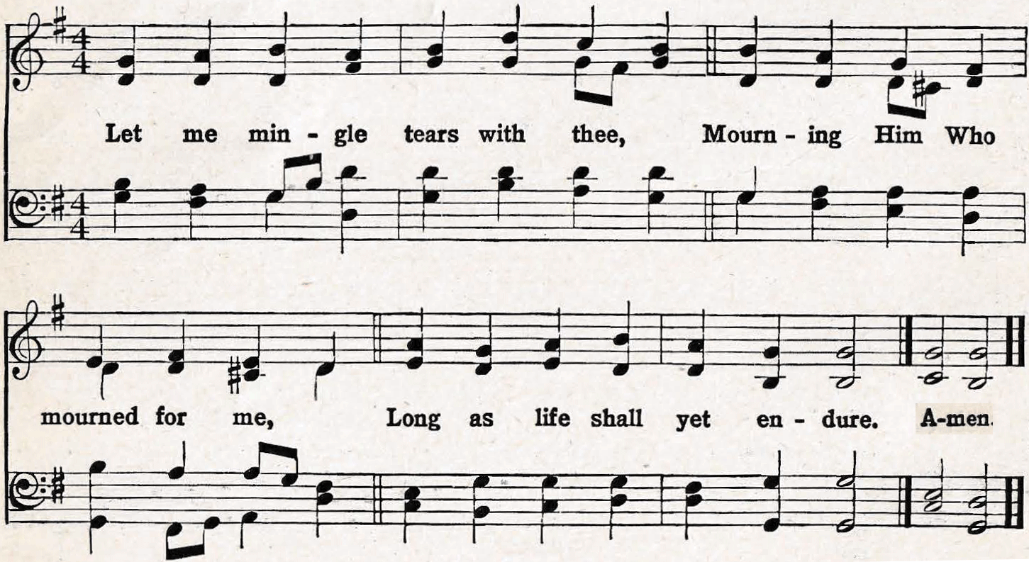 2. Have we no tears to shed for Him, While soldiers scoff and Jews deride? Ah, look how patiently He hangs: Jesus, our Love, is crucified! |