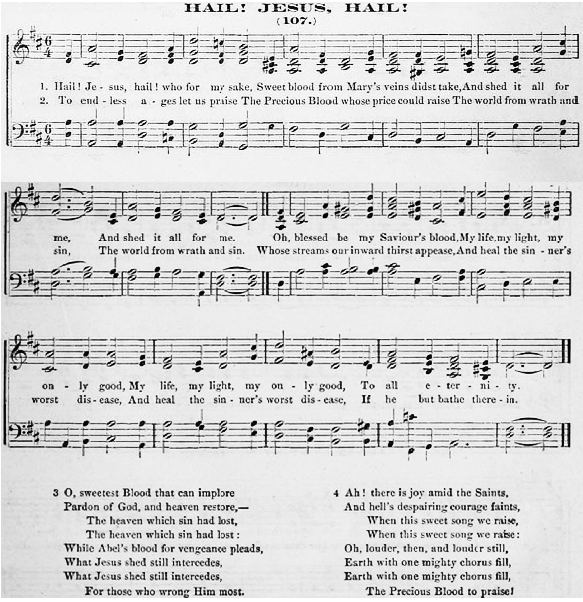 | 1. Hail, Jesus! Hail! who for my sake Sweet Blood from Mary’s veins didst take, And shed it all for me; And shed it all for me: O blessed be my Saviour’s Blood, My life, my light, my only good; My life, my light, my only good, To all eternity. |