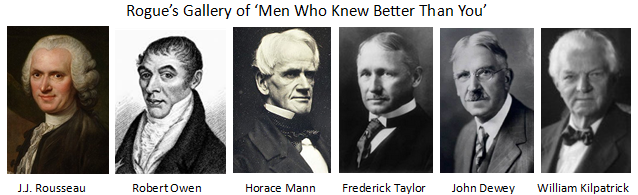 Because solid learning from ancient times, the Trivium of Grammar (the mechanics of speech and the its application to include good literature), Logic (how, not what, to think) and Rhetoric (persuading others of the truth, and learning it yourself in greater depth in the process), protected students from exploitation by elite controllers of society, students had to be subjected to the fun-house world familiar in the school institution today.